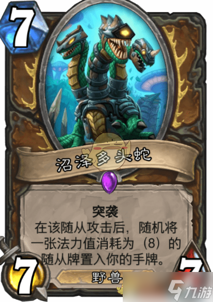 突袭技能:在此次攻击回合结束后,沼泽多头蛇将随机将一张法力值消耗为8的随从牌送入你的手牌。