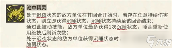 睡莲的被动技能“池中精灵”进一步强化了她的控制能力。当敌人处于“迟夜”状态且受到持续伤害时,她可以让敌人再次陷入沉睡,并附加脆弱效果。这一机制与她的其他技能相辅相成,使得她在战斗中能够持续压制敌人,为队友争取宝贵的输出时间。