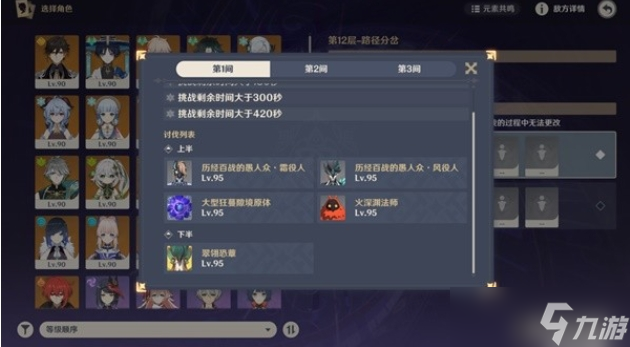 上半层推荐队伍包括:火神直伤队、克洛琳德超载队、恰斯卡队和瓦雷莎队。常用角色有火神、奶奶、希诺宁、班尼特、欧洛伦和夏沃蕾等。这些队伍组建难度较低,但要达成满星需要角色圣遗物达到小毕业水准。若主C命座不足,输出可能略显吃力。