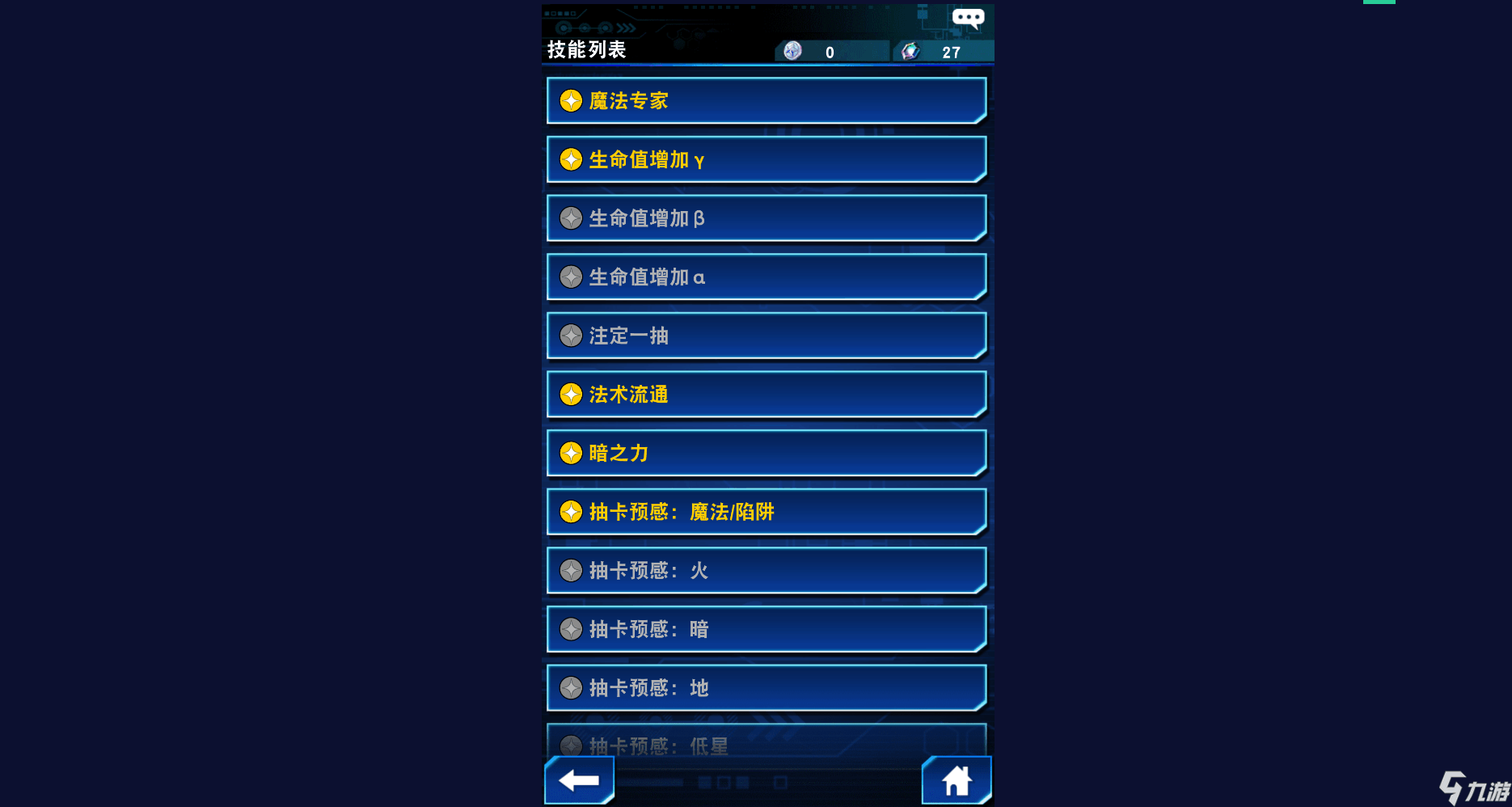 技能的种类有很多,有些技能需要自己被扣除掉一定的血量才会发动,这种技能的发动一般是主动的,我们会在抽卡是看到使用技能的选项。其他的技能有些是可以加攻击力和守备力的场地魔法卡,也有使下一次抽卡抽到特定卡牌的几率增加等等。