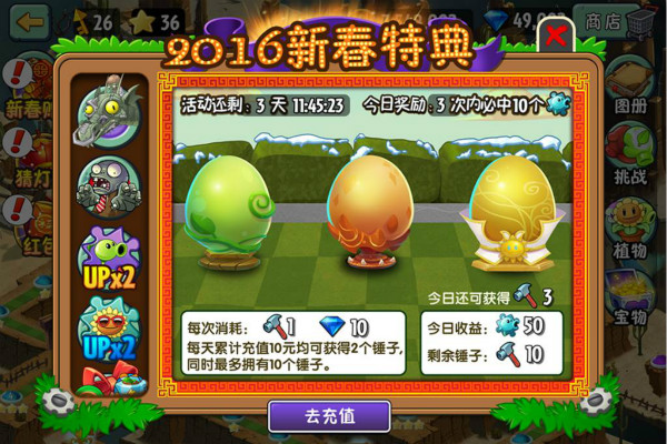 《植物大战僵尸2失落之城》上线时正逢新春佳节之际,游戏为玩家准备了点爆竹、砸金蛋、领礼包等六大福利活动,植物碎片、装扮、金币和钻石疯狂派送,为欢乐节日增福添乐!