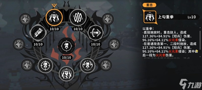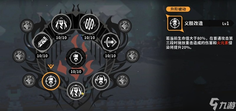 - 义肢改造:生命值大于80%时,提升普通攻击第三段重击的伤害和火元素侵染20%。