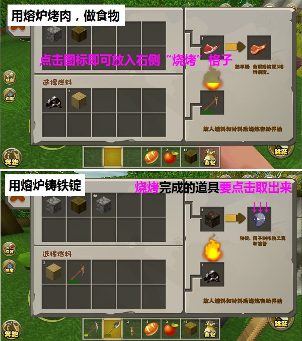 答:把肉块放进熔炉里,放上燃料,等一段时间,就会自动烤熟了