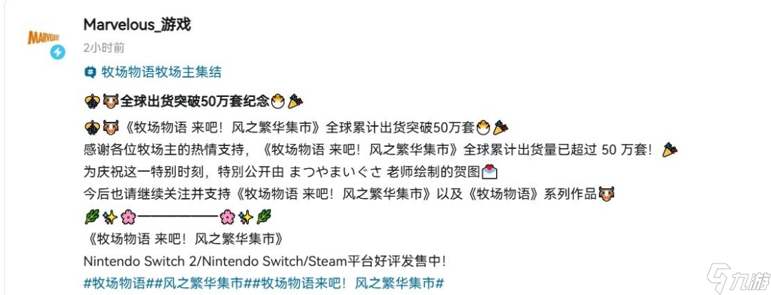 今日(9月16日),《牧场物语》开发商日本Marvelous_游戏在b站以及国内外社交媒体上发文表示《牧场物语》系列新作《牧场物语 来吧!风之繁华集市》全球累计出货量突破50万套并附上贺图。
