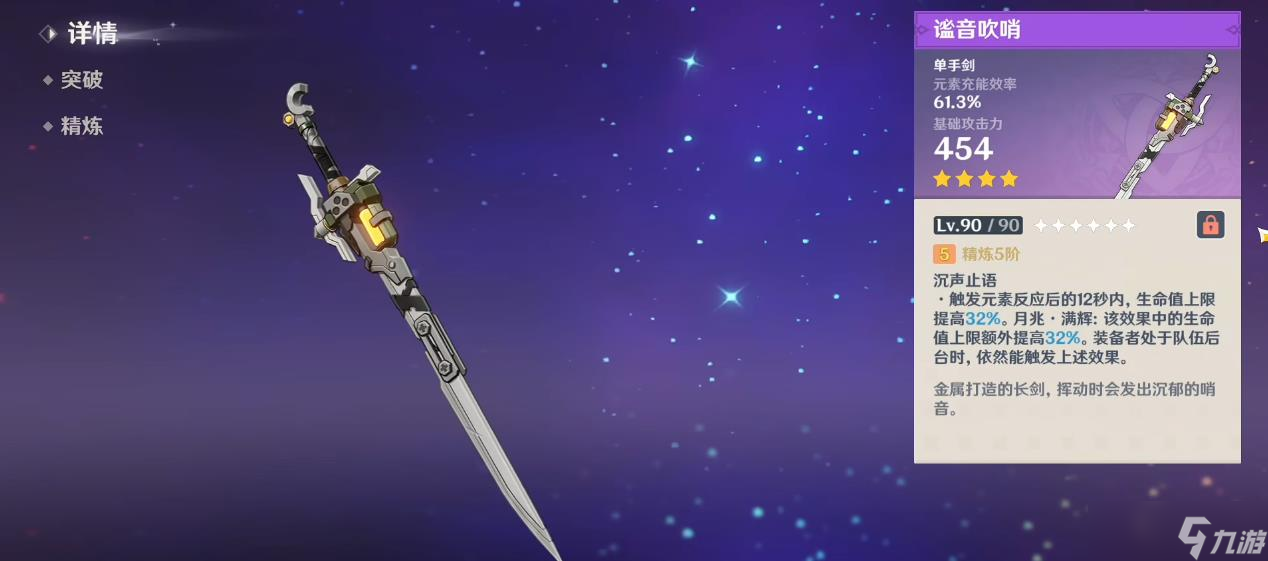 单手剑・谧音吹哨开创了生命值加成的单手剑先河。触发元素反应后 12 秒内提升 16%-64% 生命值上限,满辉状态下额外提升相同数值。这把武器 90 级提供 61.3% 元素充能效率,虽然对芙宁娜并非最优选择,但对塔利雅、妮露等生命值收益角色来说堪称神器,后台也能触发的特性进一步提升了其实用性。