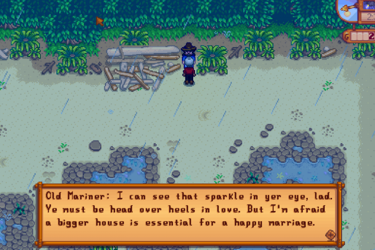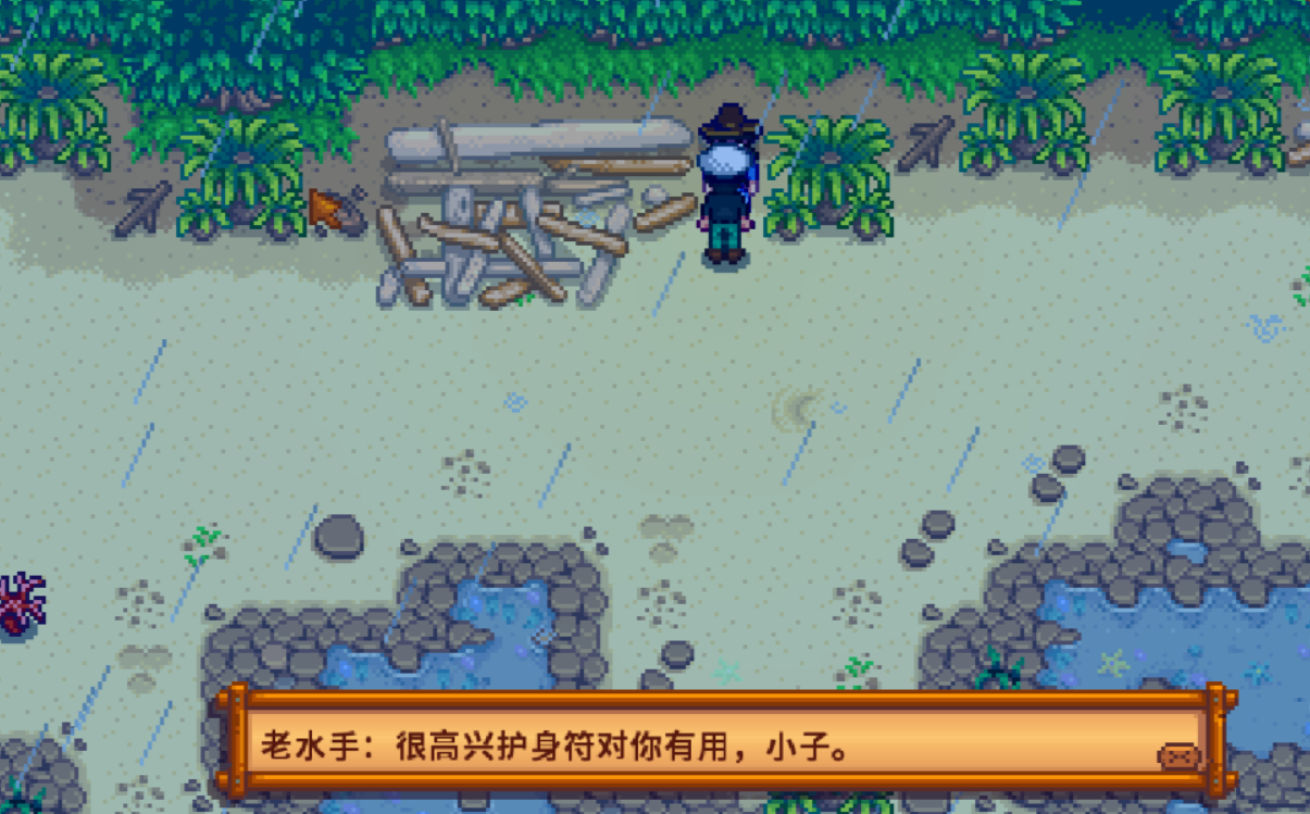 当你满足好感度要求时并且送出了一束花朵,你就可以去沙滩寻找老水手,这个像鬼一样的NPC,在见他之前需要先将断桥修好并且至少升级过一次农舍,同时还需要满足是下雨天气,注意下雪是不会出现的,下雪会被判定为晴天。