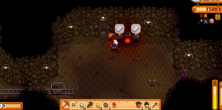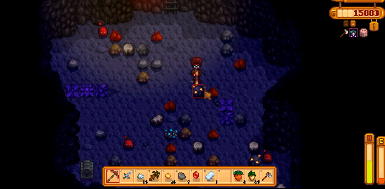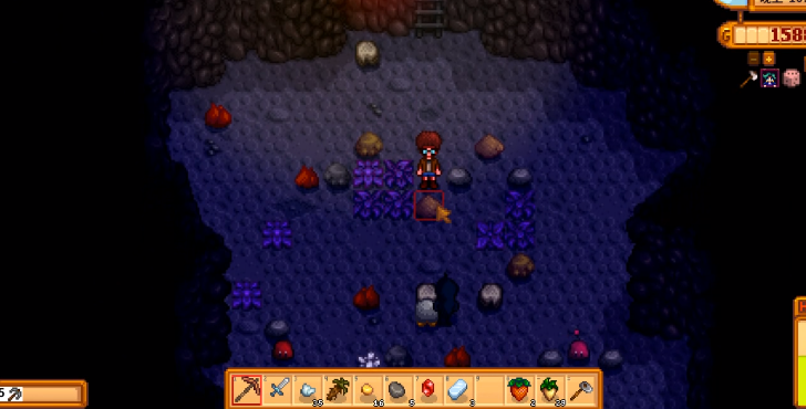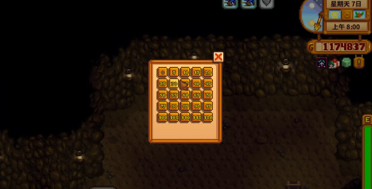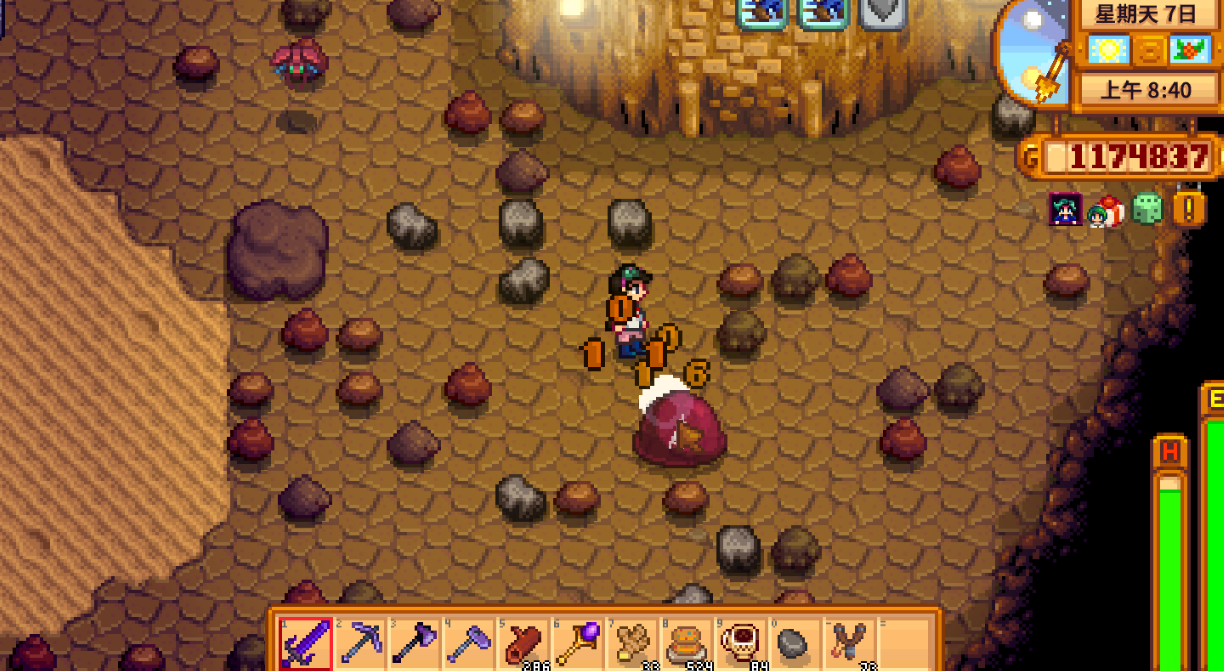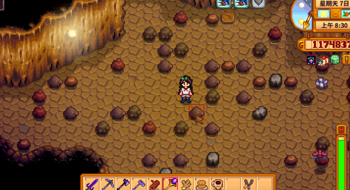 进入游戏之后,我们就需要通过不断的敲矿石来找到下一层的楼梯,在石头很多的位置,玩家可以用炸弹炸一下,可以节省更多的时间,玩家可以在五星好运的时候去冲矿层,运气特别差的时候就刷刷矿石就行。