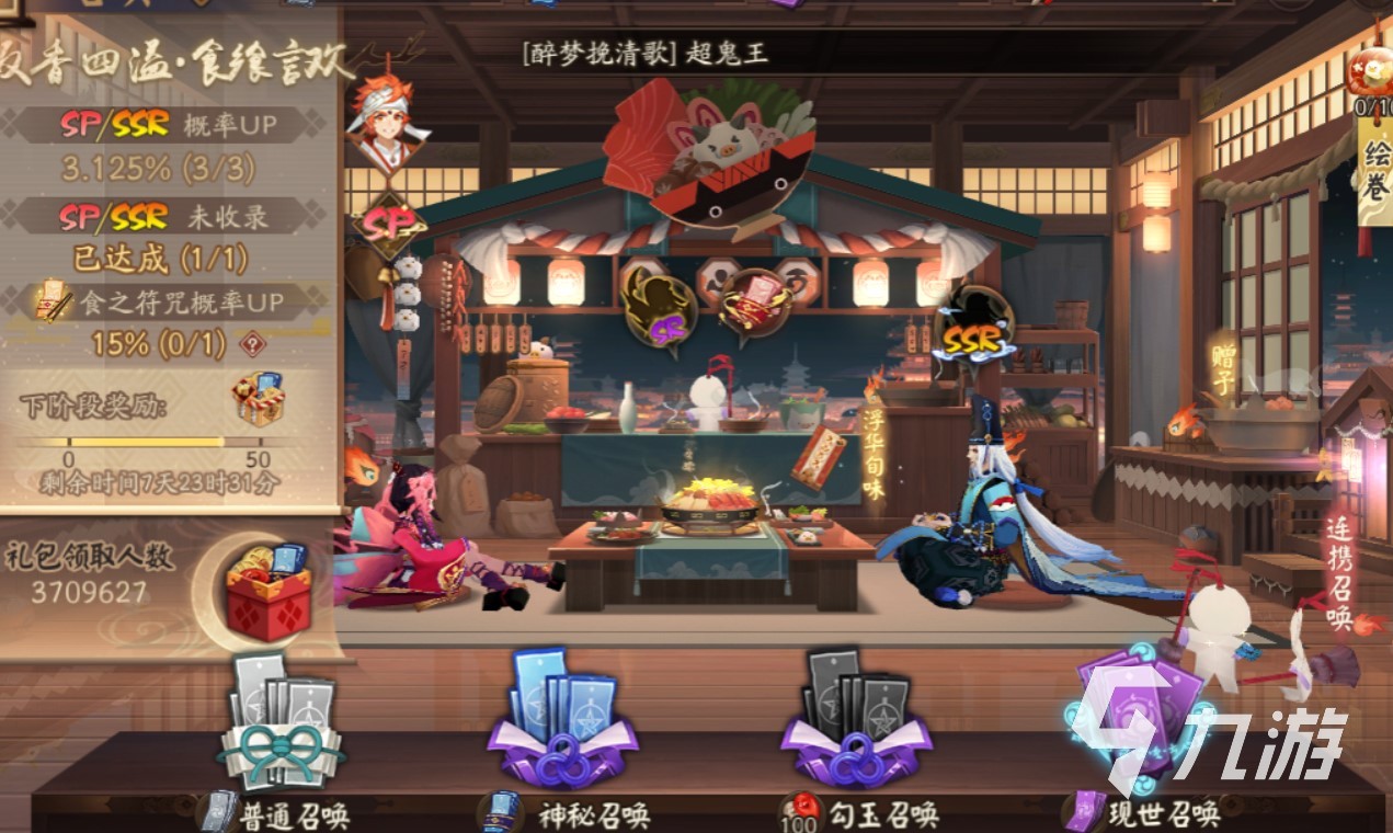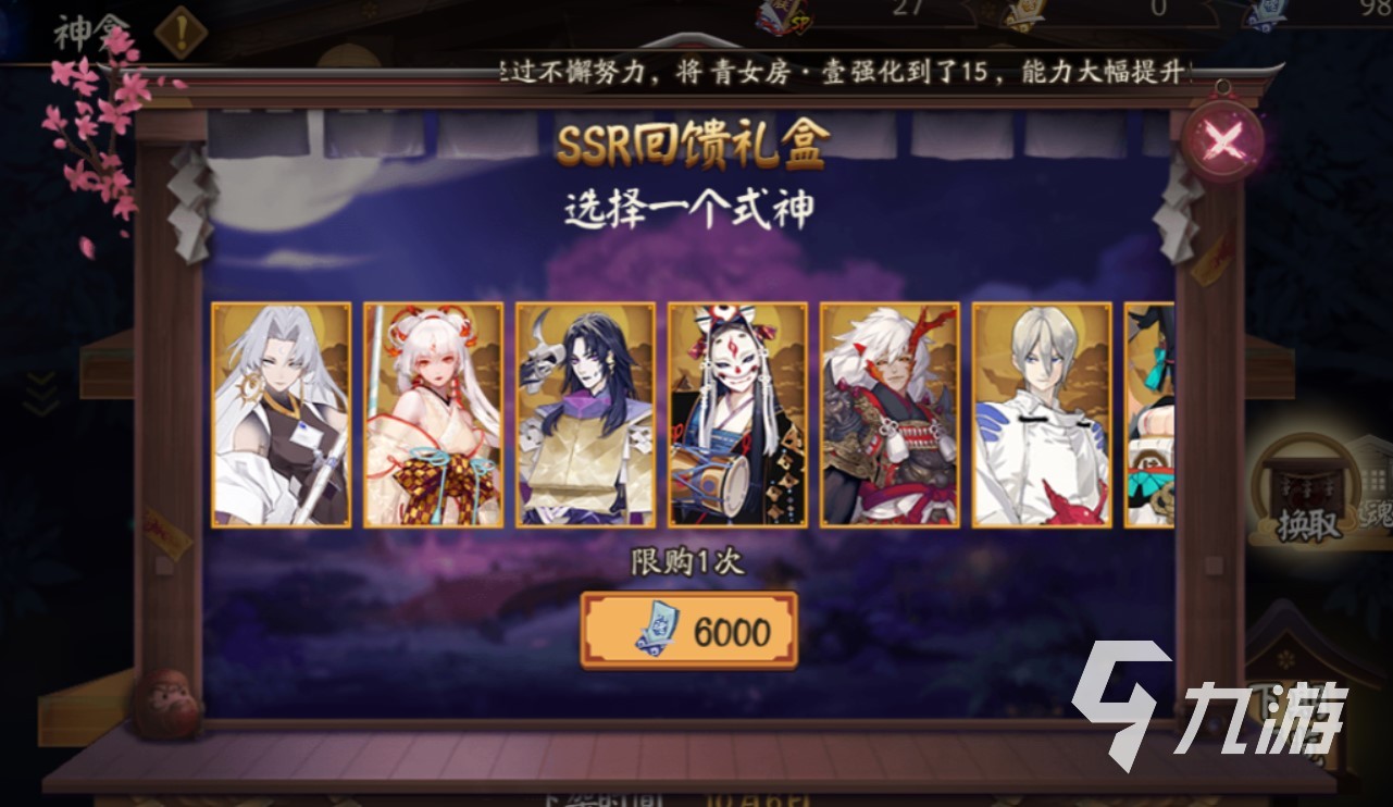 4.SSR重临神龛,这次不再是神龛六君子,终于他们新添了几名成员,除了之前的小鹿男、茨木童子、大天狗、妖刀姬、花鸟卷、青行灯、一目连、阎魔,有加了八岐大蛇、不知火、泷夜叉姬和玉藻前。使用6000御札即可兑换,期间只能兑换一次。