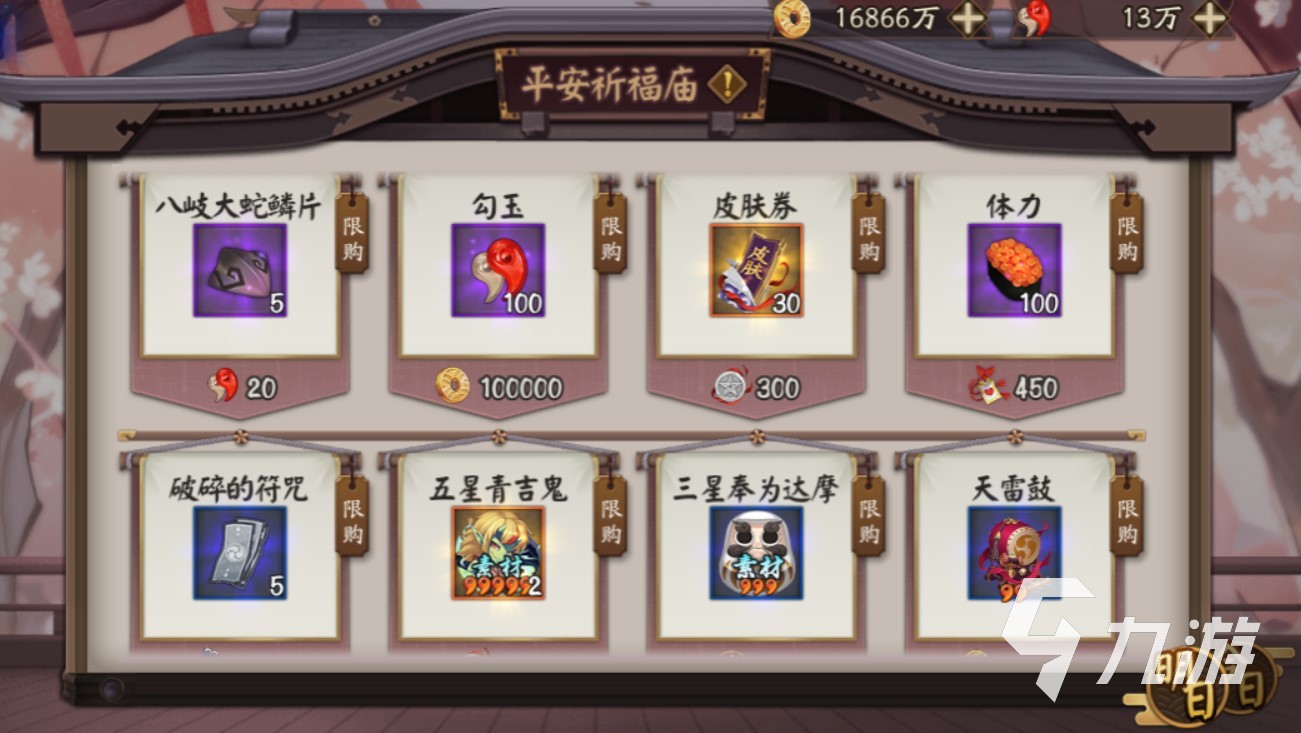 2.平安祈福庙活动,每天0点刷新商品,且商品只能购买一次,运气好的玩家可以刷到6星美食卡、蓝票、100勾玉等奖励。