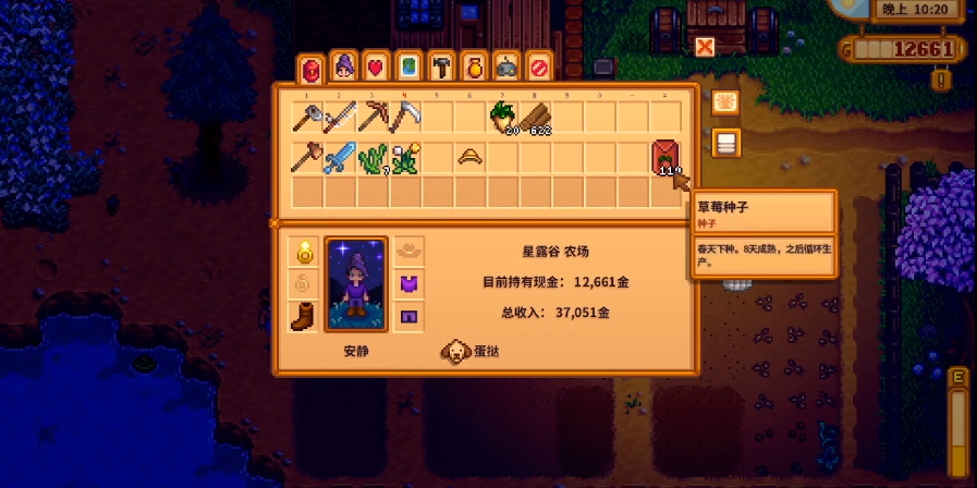 草莓是春天的主要经济作物,虽然生长阶段长但是不需要反复种植,成熟后即可保持四天一收获,省心省力。且草莓在市场上的售价很高,拿去送礼也是不错的礼物,可以快速提高NPC的好感度。有能力的玩家在春天可以考虑多种一些草莓来应对之后的复活节。