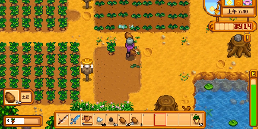 首先是土豆,土豆是星露谷物语游戏中前期非常好用的食品作物,不管是拿来烹调还是拿来卖钱都很合适。土豆的种植周期短,收获频率高,且种植成本极低,土豆对应的种子是刚开始村长就会免费赠送给玩家的,基本没有开荒难度。土豆在春季种植后可以大量囤积到冬季过冬,属于过冬常用储备之一。