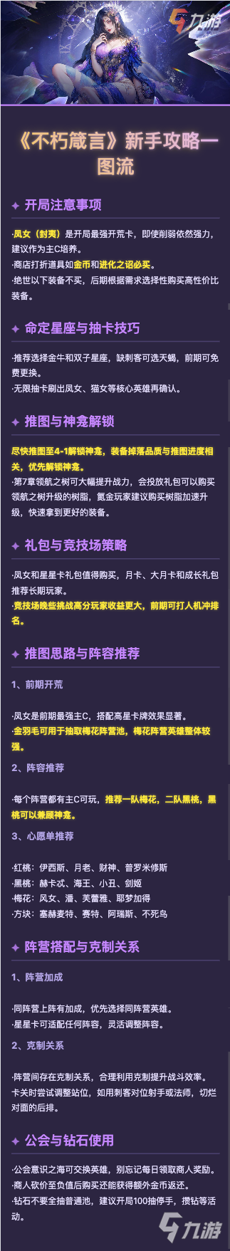 《不朽箴言》新手入门必看!一图流攻略带你快速开局,强力推荐凤女主C,金牛双子星座优先,抽卡技巧、推图要点与阵容搭配一网打尽,助你轻松闯关不走弯路!