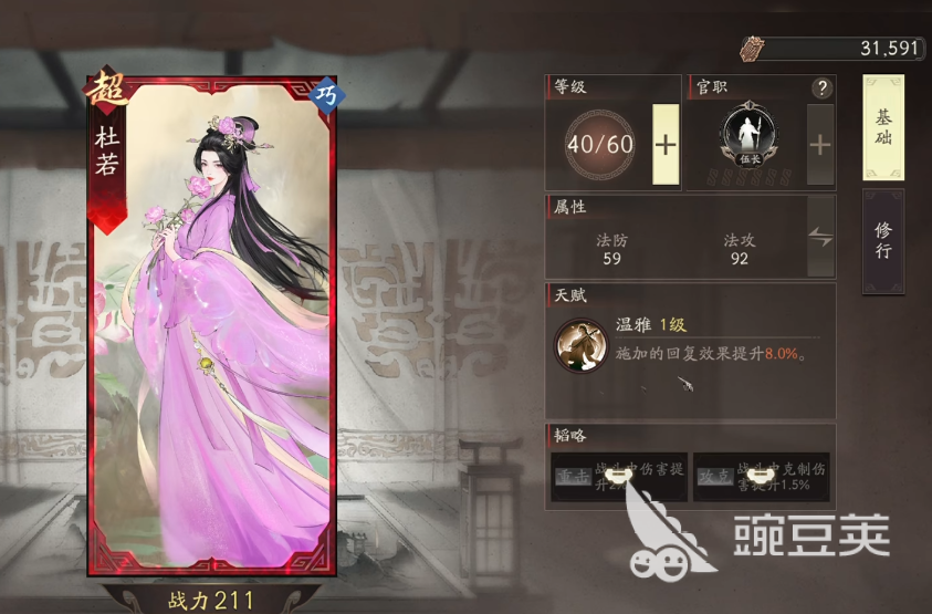 杜若在属性上属于“巧”,游戏在战斗机制上有属性相克机制,巧能克制勇,同时受制于严。在对战开始前能了解多方的属性,利用属性克制也能帮助玩家更好的应战。杜若的天赋是“温雅”,每提升一次能增加恢复效果。在韬略上可以选择增加攻击属性或者是属性克制效果。