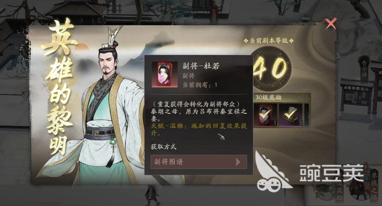 在杜若的获得方式上,玩家等级达到30级的时候,在等级奖励在即可领取杜拓若副将,如果玩家距离30级尚有距离,可以尝试探访玩法来解锁这个副将。在探访玩法上是有次数限制,以及需要先解锁当下派系金色品质副将后才可以解锁红色品质,想要通过探访来解锁杜若的话,要合理安排每日探访的角色和次数。