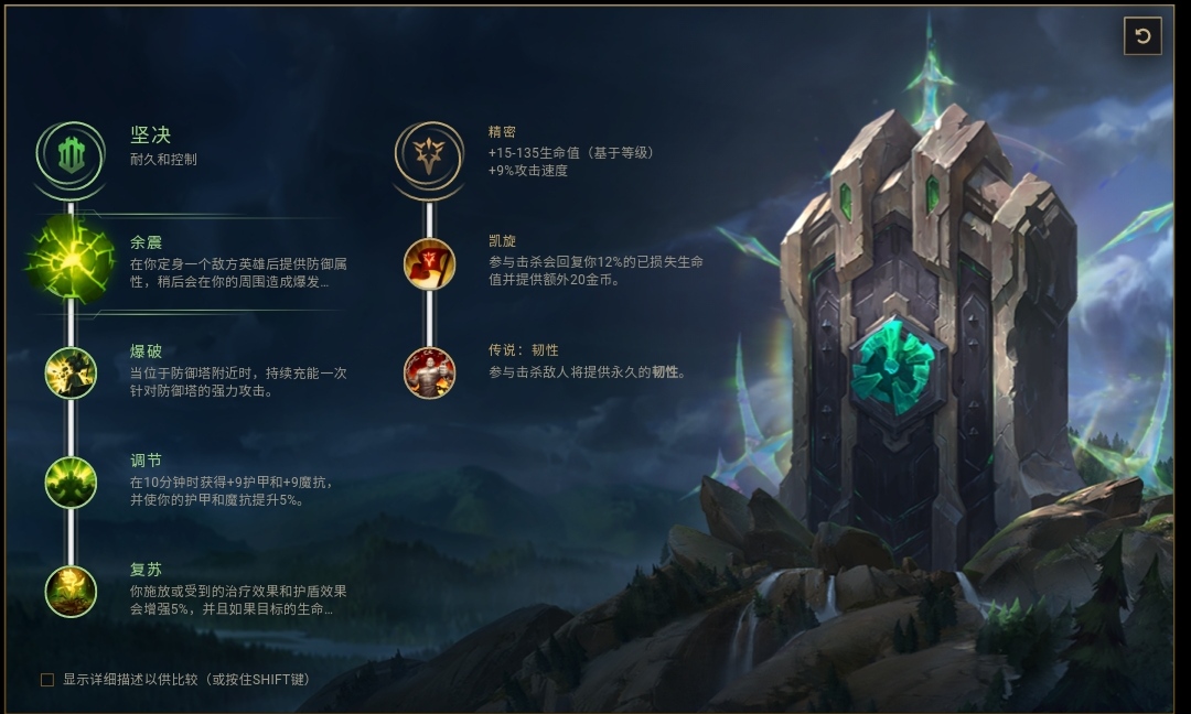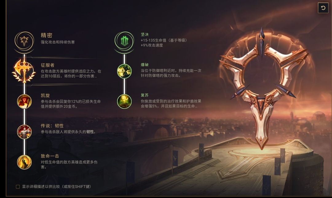 首先我们来看看宝石的符文天赋:主天赋带精密、征服者、凯旋、韧性、致命一击,副天赋带坚决、调节、坚定,小符文带一个冷却缩减、一个自适应之力、一个护甲值。