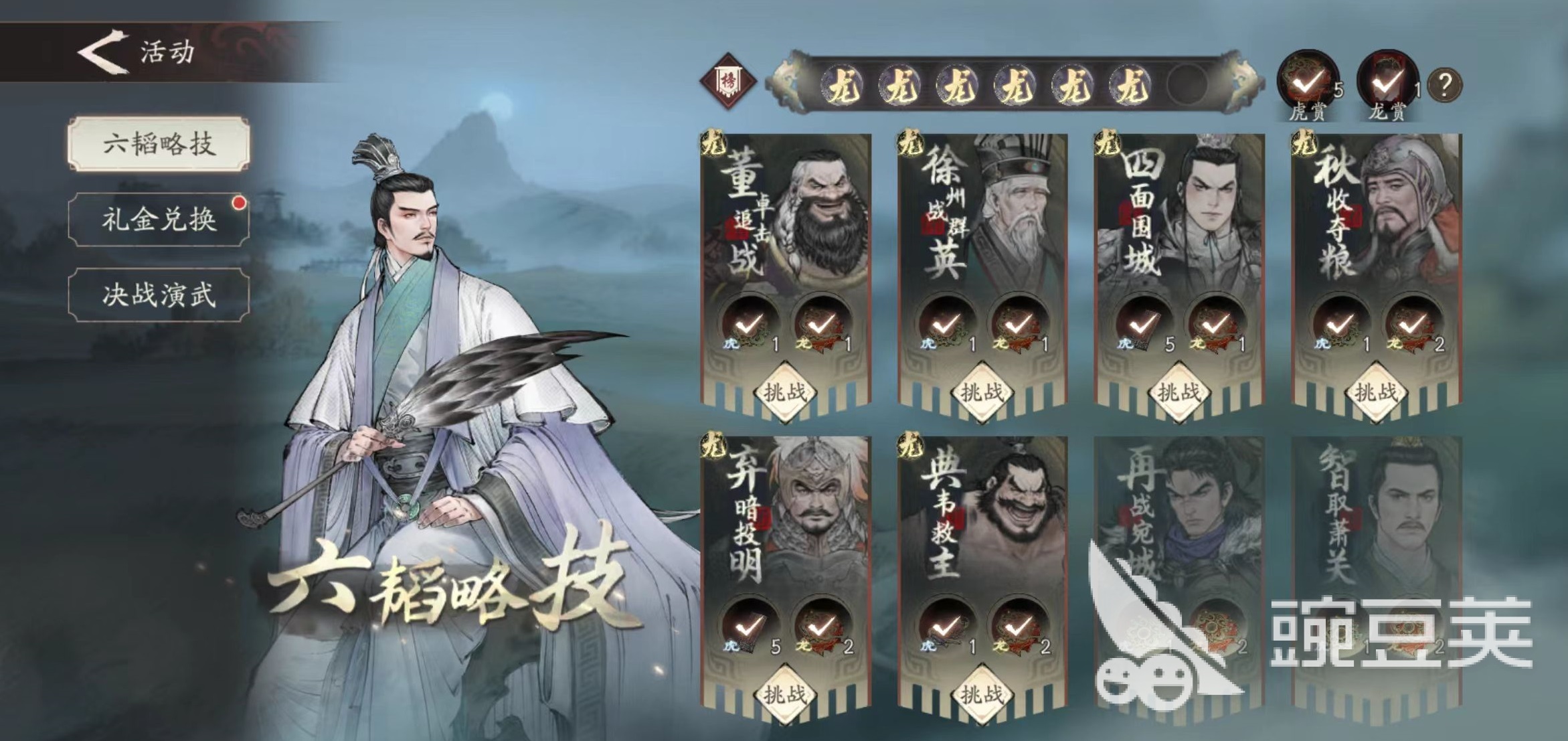 六韬的全称是六韬略记,是属于游戏开放的活动之一,目前一共开放了8个不同的关卡,每个关卡也有不同的难度,大家只需要点击右上角的活动按钮,然后就可以进入到这个活动中了。这里需要注意的是六韬略记和见真章这个活动,很多关卡都是同名的,但是奖励和难度都不相同,所以大家要区分清楚。