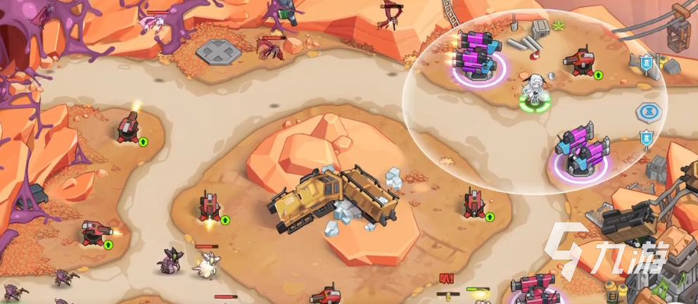 从玩法上来看是即时塔防加上英雄操作,可能一开始玩家会觉得有一些懵。那首先就应该了解怪物全部都是从红圈里面出来,所以必须要在有标牌的地方去创建机关枪或者是发射炮。通过打怪就可以赚取金币,记得要用金币去升级武器,否则下一波如果遇到更强的怪物,根本就没有办法抵抗。需要注意的是,这些塔防武器就只能在局内培养,局外是没有办法升级的,因此一定要选择规划好资源。