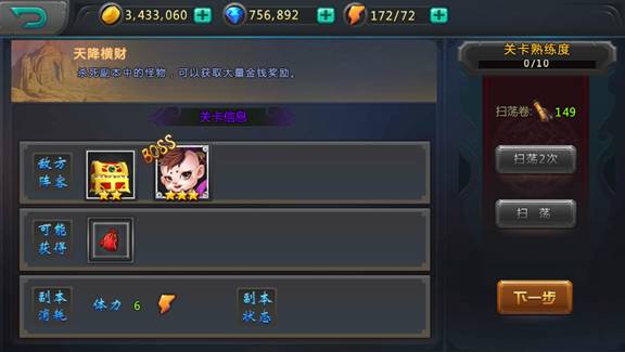 进入之后,如果在之前三星通关即可进行扫荡。点击下一步后设置自己的队伍开始战斗。