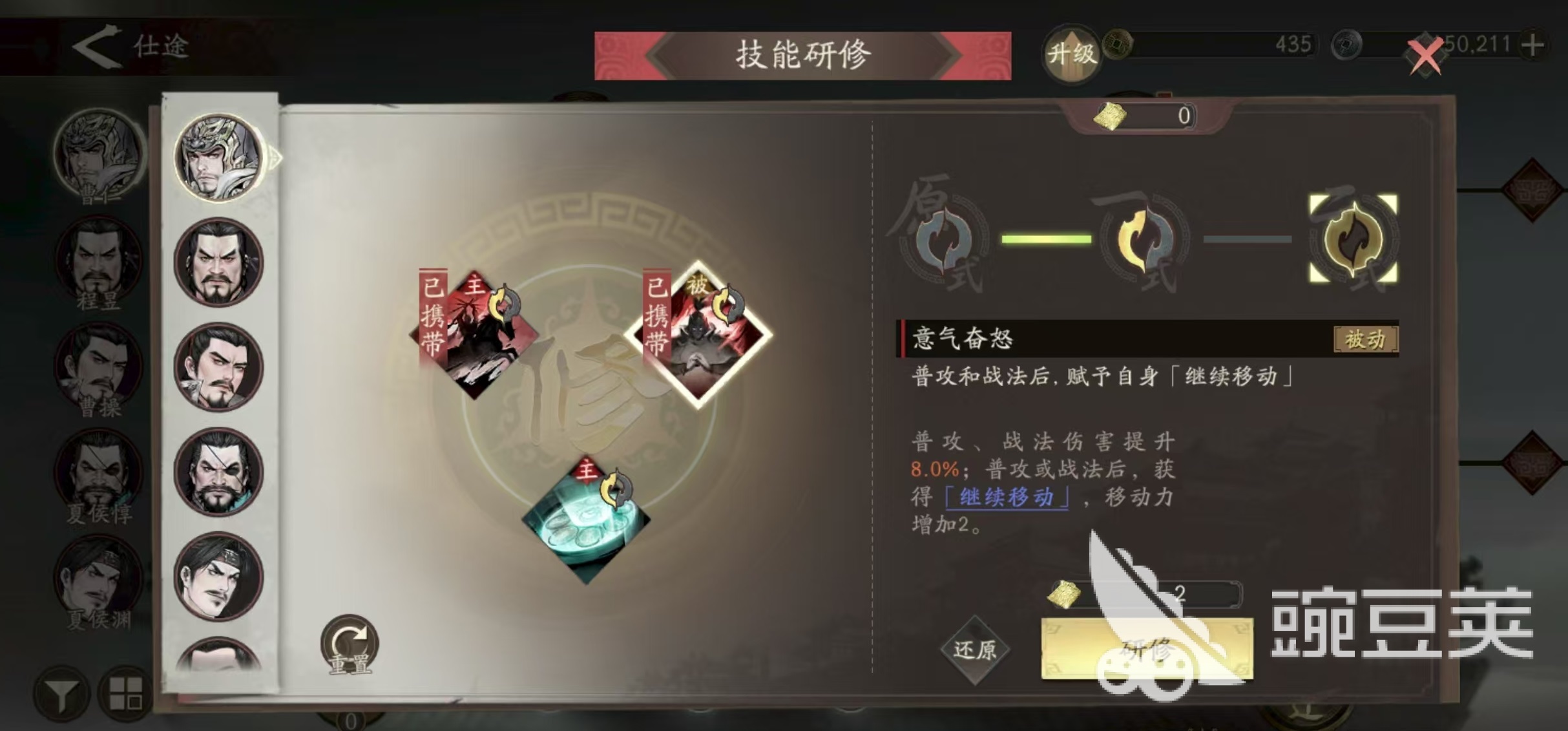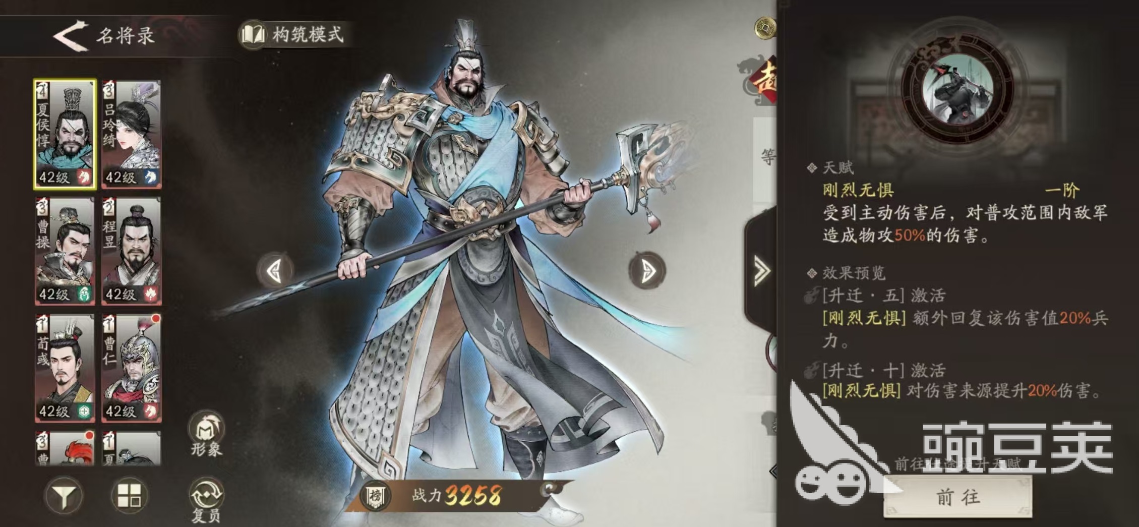 第2个是于禁,于禁是属于游戏中合击流派的核心武将,只要在自身攻击范围之内被敌人合击,就会触发奋战效果,对目标造成连击伤害。而且奋战是无视部分防御值的,搭配好之后输出效果非常出色。第3个是夏侯惇,夏侯惇作为版本初始就直接赠送的武将,也是前期必备的骑兵将领被,动技能在受到攻击时可以反击并且吸血,生存能力和输出能力都很强。在前期小兵比较多的副本中,夏侯敦的表现非常出色,也是中后期选择前排时的首选。