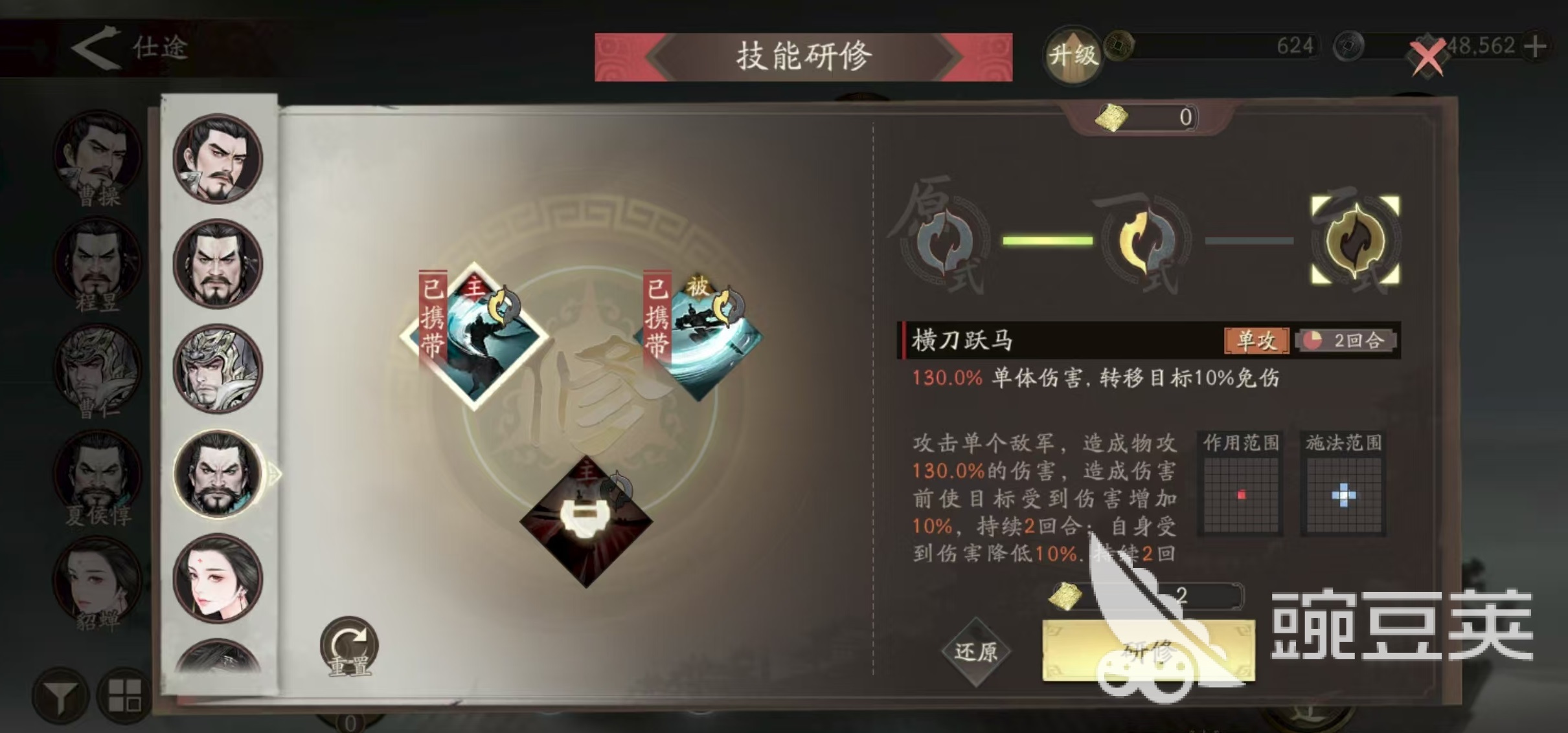 首先是曹仁,曹仁是新手武将中的佼佼者,不仅属性一流,而且技能还具有恢复、增伤、增防、减防、真伤、位移、护盾等一系列能力。他的被动技能可在造成伤害后恢复兵力,奋战带来的无视防御效果和增伤,八门金锁为范围内的我方军队赋予护盾和意气等效果。很适合在前期开荒时选择,在中后期应对一些难度较高的关卡时,曹仁同样可以出战。所以是一个从前期能一直用到后期的平民型武将。