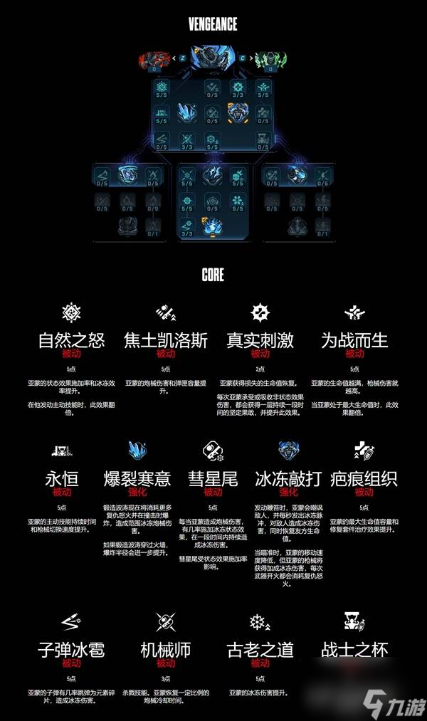 ·鞭笞(复仇怒火技能树):亚蒙装备锻造盾牌吸收所有正面伤害,并转化为复仇怒火。当复仇怒火条全满时,锻造盾牌则会提供伤害减免。如一段时间内未获得复仇怒火,其会迅速消耗。按下主动技能发射锻造波涛,对穿过的敌人造成冰冻炮械伤害,并会消耗复仇怒火提升造成的伤害。