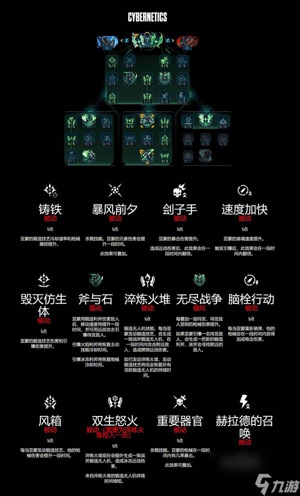 ·严酷熔炉(神经机械技能树):亚蒙装备锻造利斧,可进行投掷并能从地面拾取以返还冷却时间。可投掷火焰利斧,造成燃烧近战伤害,也可投掷冰霜利斧,造成冰冻近战伤害。被锻造利斧伤害的敌人会在一段时间内陷入待发状态,当其死亡或被锻造技艺伤害时将引爆,对附近敌人造成伤害。