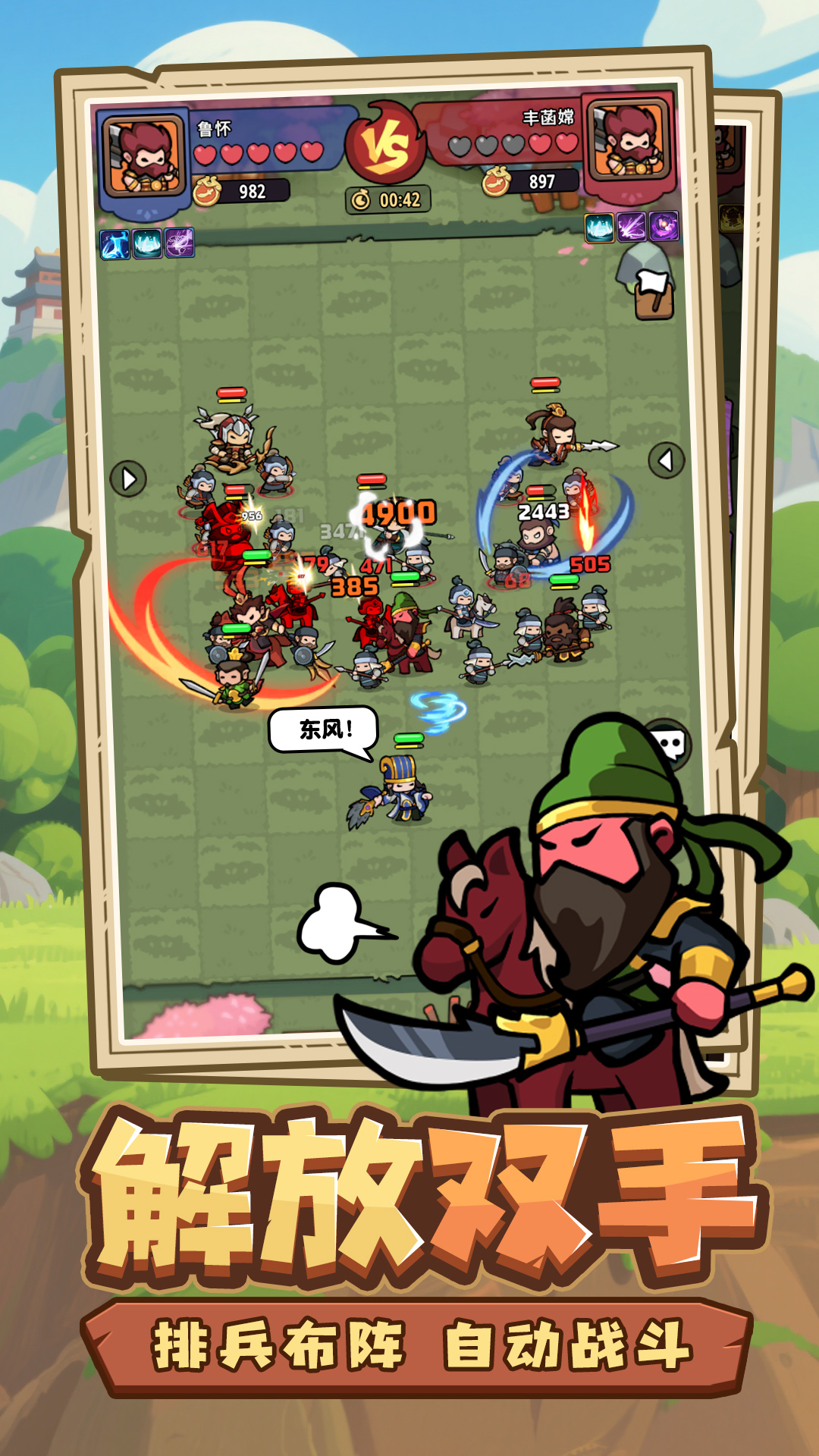 我们是一款融合了Roguelike和自走棋策略对战的Q版三国游戏,每一局都带来全新的阵容和体验!我强烈推荐喜欢策略、收集、轻度至中度游戏的玩家,三国题材和肉鸽游戏的粉丝加入!核心亮点:1.多重副本- 汉旌再卷 王者之争 乱世称雄...- 策略不再停留在战前布阵,战斗中即时响应,体验真正的肉鸽快感!-自走棋+肉鸽的玩法独一份,放置棋子、等待自动战斗,每个关卡都各有特色。2. 深度策略卡牌,百将养成:- 收集魏、蜀、吴三国名将(关羽、吕布、诸葛亮、周瑜...),每位武将拥有独特技能、定位与羁绊。- 深度策略养成:精心搭配阵容,激活强力羁绊,打造属于你的“东吴都督”或“曹魏精锐”。- 多维度培养:升级、进阶、装备、天赋... 全方位提升武将实力,应对不同战场挑战。3. 自走棋+肉鸽,成长无忧:- 轻松放置,资源不断!即使离线,武将持续历练,源源不断获取丰厚资源。- 合理利用资源,上线即可调配资源、研究策略、参与激战,兼顾深度策略与轻松体验。准备好迎接挑战了吗?立即加入《神将风云》书写属于自己的霸业之路!