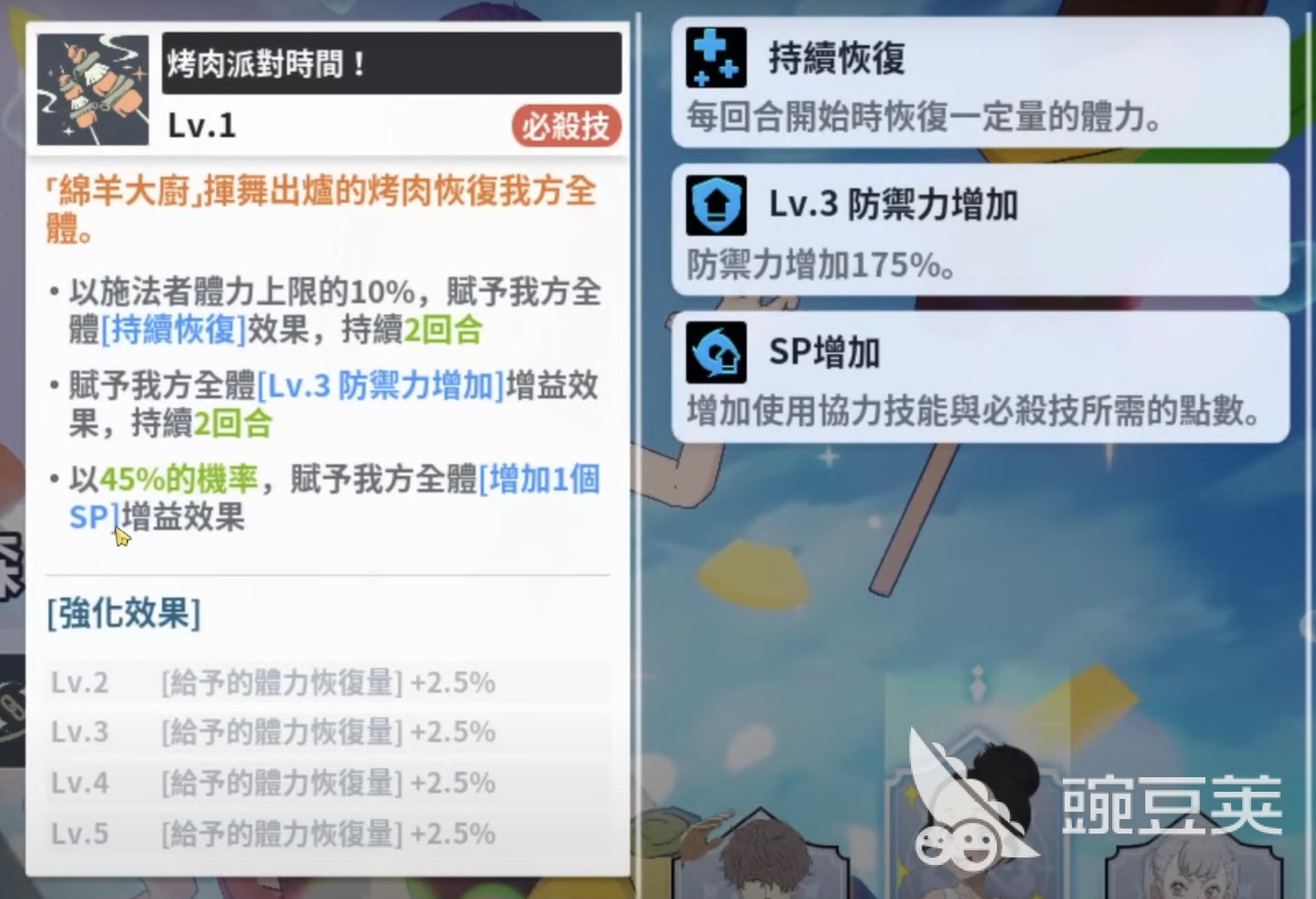 恰米的必杀技“烧烤派对时间”,不仅提供全队治疗,还能提升防御力增益,并有概率让队友获得SP,使队伍在长时间战斗中持续高效输出。技配合觉醒被动和专属被动,恰米还能在盟友回合结束时为生命值最低的队友恢复生命值,并增加自身最大生命值,为队伍提供稳定续航,让战斗打得更轻松和持续。