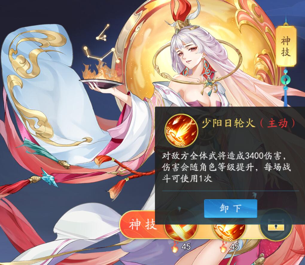 不知道小将军有没有注意到,神技「少阳日轮火」对敌方全体的伤害会随着角色等级提升而提升的。小将军可要加油升级哦!