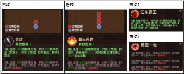 根据原型游戏内定位为物攻型,武将初始资质为20,红将英雄,擅长使剑,喜好古董和丹青(主公们游戏中送礼后会随机收到武将回复的小惊喜哦~)