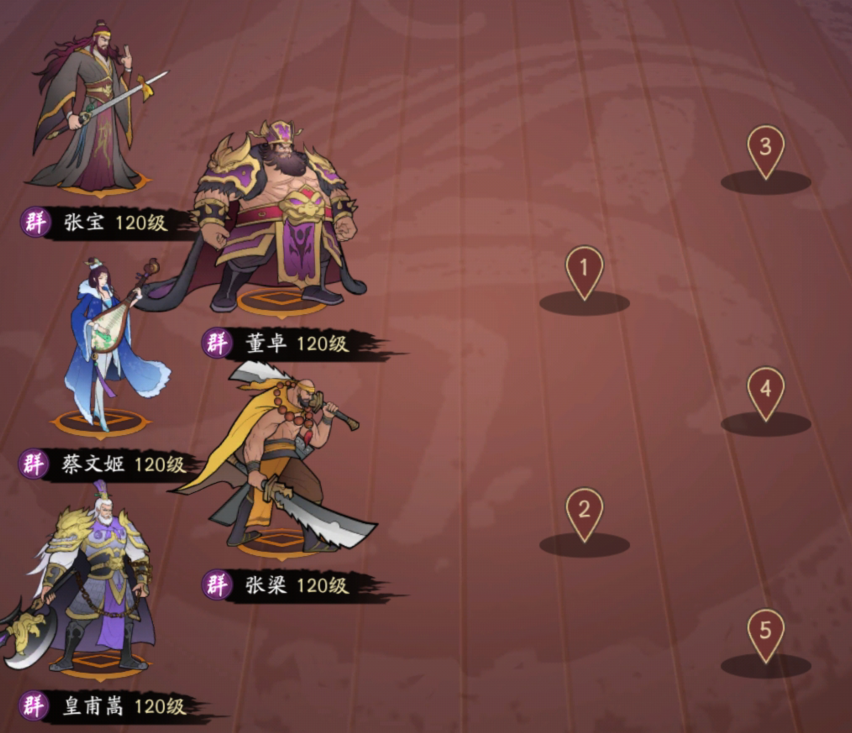 【群雄】前排:董卓+张梁,后排:张宝+蔡文姬+皇甫嵩。前排可用文丑、吕布替换,后排可用李儒、张角替换。