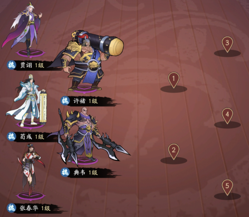 【魏国】前排:许褚+典韦 ,后排:贾诩+荀彧+张春华。前排可用曹仁、张辽替换,后排可用甄宓替换。