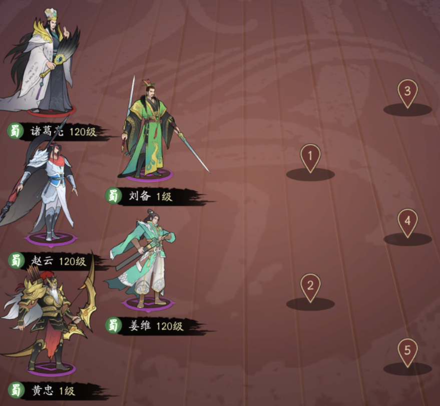 【蜀国】前排:刘备+姜维,后排:诸葛亮+赵云+黄忠。前排可用关羽、张飞、马超和庞统替换,后排可用法正替换。