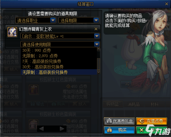 3.点击购买时装,然后会弹出选择属性和支付的选项,选择好了属性之后往下面拉,会看到使用期限选择,就是支付的选项了,找到最下面的后面带有“高级或普通装扮兑换券”然后按照对应期限选择它就可以了。