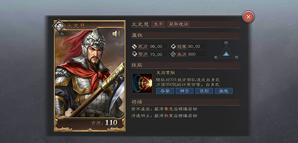 在三国志威力无双的世界中,太史慈作为资质110点的弓兵武将代表,主公们只需首充就能将其收入囊中啦!弓兵作为队伍中的主力输出点,大家在排兵布阵的时候,务必将其保护起来,以防敌方骑兵近身,其持续输出能力必然能让敌方“痛不欲生”呀!看到这里,想必太史慈的形象在主公们心中已经渐渐清晰,若是对这位吴国的神射手心生喜爱,那就早点进入游戏获取吧!想必他会给主公们带来强大助力的!