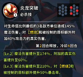 对生命值比例最低的3名敌方单位造成145%魔法伤害,对【燃烧】和被控制的目标额外附加40%攻击力的真实伤害。第2回合释放,冷却4回合
