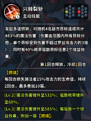 对随机4名敌方目标造成共计483%魔法伤害(伤害由范围内所有目标分担,单个目标受到伤害不超过罗丝攻击力的3倍);同时有40%概率驱散目标任意2个增益效果。第1回合释放,冷却2回合