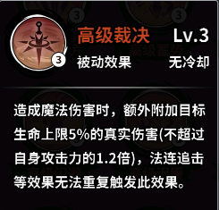 裁决魂石属性:造成魔法伤害时,额外附加目标生命上限5%的真实伤害( 不超过自身攻击力的1.2倍),法连追击等效果无法重发触发此效果(进一步增加罗丝的输出)