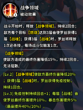 [Lv.2]【战争领域】使敌方最终伤害降低20%;获得5层【战魂】时,罗丝获得免疫控制,持续1回合