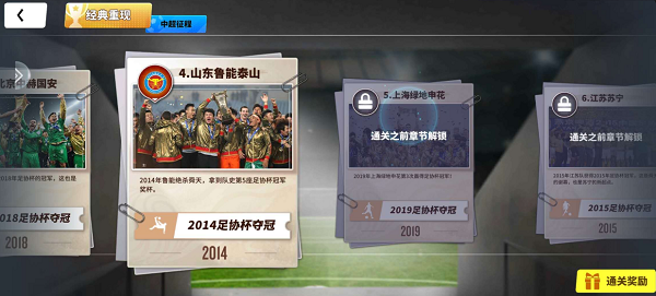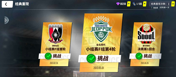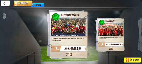 上两张截图是经典重现玩法的界面,其中包括恒大2013亚冠之旅,上海上港中超联赛冠军,北京中赫国安2018年足协杯冠军等等。点进去以后会出现下图界面,例如恒大的2013亚冠之旅会有三个分支,也就是三场比赛,分别是对阵浦和红钻,全北现代,和首尔FC。
