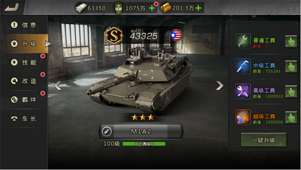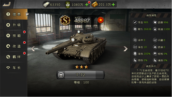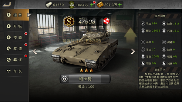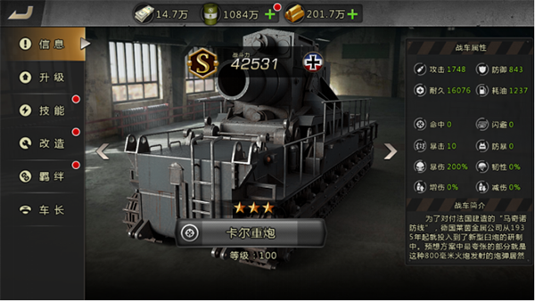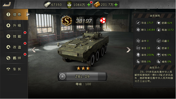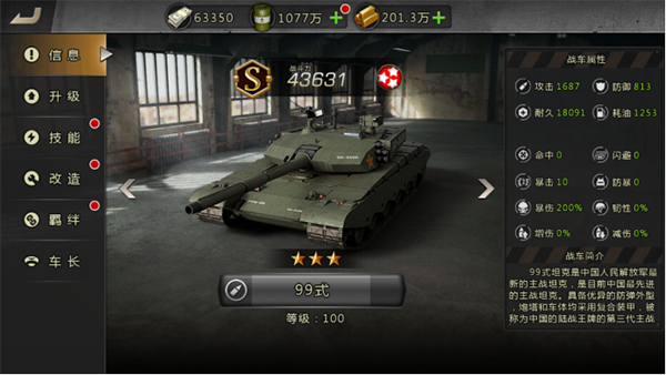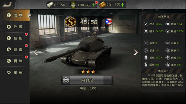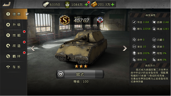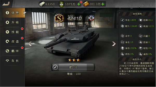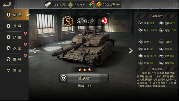 1、主战炮:发射主战炮,对敌军前排造成200%+200伤害并降低10%防御和免伤,持续6秒