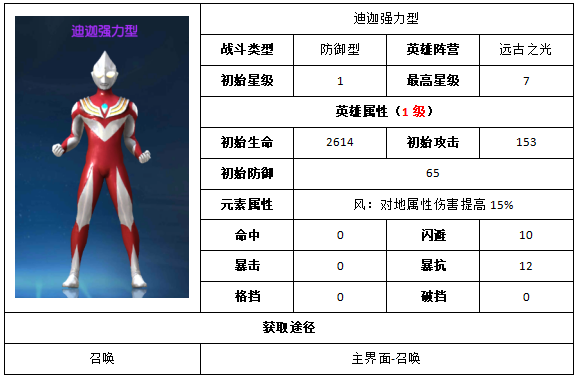 今天小编为大家介绍游戏内的人气英雄,前排超级坦克,力量优秀且兼顾超高防御的奥特战士——迪迦奥特曼:强力型。