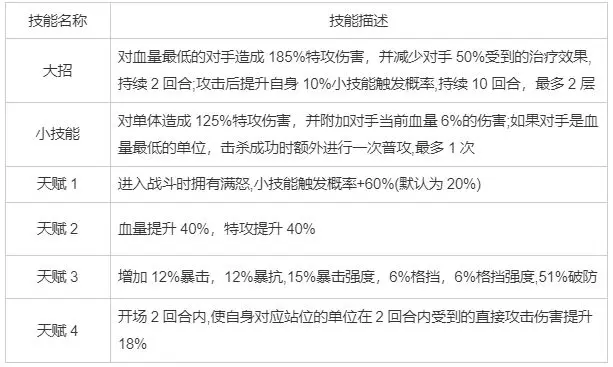 旋风舞兔是一只草系SSR精灵,专注于破盾猛攻。利用其大招可对敌方血量最低单位造成高额特攻伤害并降低其治疗接受率,同时增加自身小技能的触发概率。小技能同样强大,能根据敌方当前血量附加额外伤害,并在击杀血量最低单位时触发额外一次普攻。天赋确保其进场即满怒,小技能触发率高,大幅加强了特攻和血量,以及显著提升了爆击率、爆击伤害和破防效果,使其成为战场上的强力输出单位。