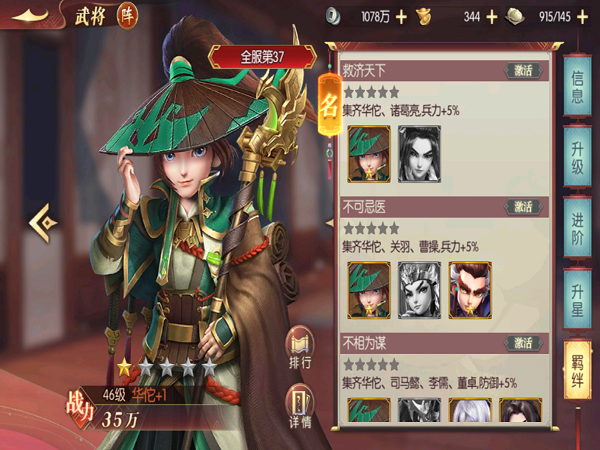 总结:《远征三国》中输出站得住才能走的更远,奶+输出是每个阵容必备的,作为全服第一奶爸,华佗治疗技能十分给力,关键时候为输出加血续航,无论推图、竞技都很需要这个英雄,绝对是值得培养的武将,推荐人手必备。