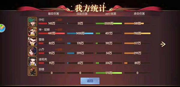 游戏中的华佗是一个加血英雄,在推图中,带上他的效果可是很明显的,华佗的站位当然是后排,下图可以看到实战中华佗奶量。