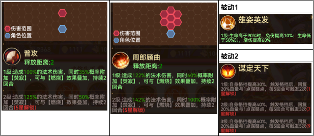 周瑜从当前版本来看应该妥妥法攻输出武将NO.1了,除正常法术输出外还有额外的【焚寂】效果。(敲黑板)这里必须科普下吴国火焰流,吴国武将很多都带有【燃烧】效果,但是【燃烧】效果多次触发时,只会计算1层的伤害,但是【焚寂】是可以和【燃烧】叠加造成伤害的,配合孙策对【焚寂】效果目标造成额外伤害,在持续输出和AOE范围攻击上,吴国红将相对其他阵营拥有更强大的输出。周瑜缺点也较明显,就是依赖持续输出需要能抗的身板,但是如果堆了肉,输出又会减少。所以配合其被动貌似也可解决,堆格挡属性来代替血量、防御这种属性,宝物可搭配格挡回血、吸血等类型宝物,在保证生存的情况下去极限堆输出可使周瑜伤害最大化。(来自军师大大的小提醒):这里有个小细节,假如敌方3刀砍死周瑜,堆防御时应考虑保证周瑜能抗4刀才有意义,否则额外堆叠的防御属性不如改堆输出,此处细节需依赖PVP水平接近对手属性来具体决定,去多多切磋吧~