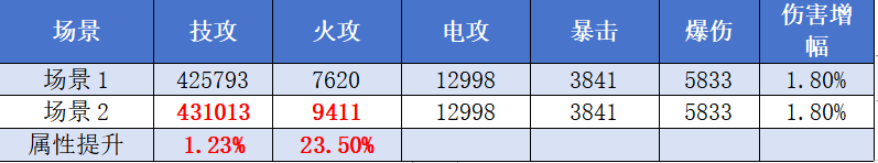 从测试结果可以看出,场景2比场景1技攻只提升了1.23%,火攻提升了23.5%,而火属性技能伤害平均提高了14.74%,远远大于非火属性技能伤害的提升。本次测试由于火攻伤害数值所占技攻总伤害数值的比例过低,因此属性伤害提升比值不高,实际属性攻击属性的提升对同属性技能伤害的提升效果非常大,远大于技攻对技能的伤害提升。