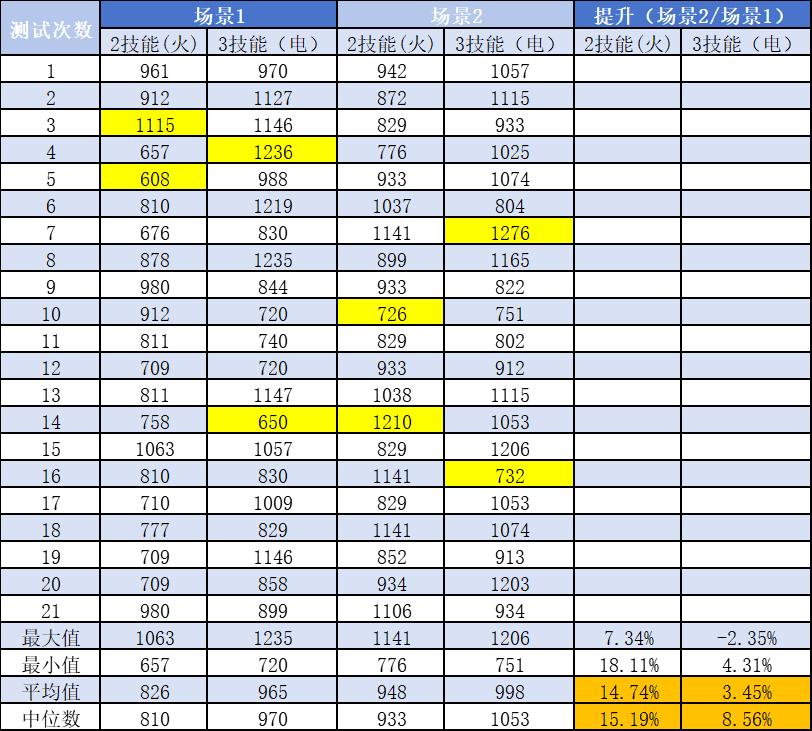整个对比实验分别测试了场景1、场景2下的2技能、3技能伤害21次,去掉21次测试结果中的最大值、最小值,取了19组数据计算,对比如下: