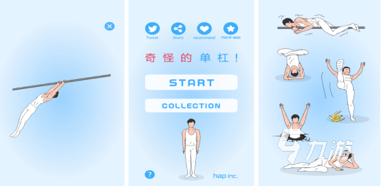在点击游戏开始之后,将会看到一名帅气的体操选手在单杠面前展现自己各自的优势,从整体的画风上来看,融入大量的恶搞元素,还有搞笑的情节。只需点击屏幕就可让其中的选手完成单杠表演,但是更加注重的就是合适的时机,必须在关键时刻把握时机,通过向左或向右摆动,加速的方式快速完成挑战。