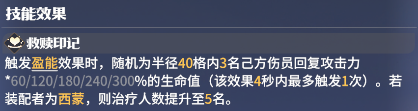 1、救赎印记(专属): 触发盈能效果时,随机为半径40格内3名己方伤员回复攻击力*60/120/180/240/300%的生命值(该效果4秒内最多触发1次)。若装配者为西蒙,则治疗人数提升至5名。